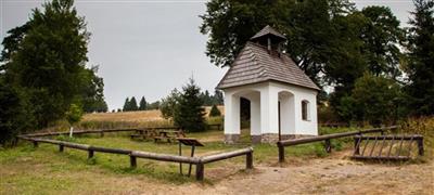 Zaniklá šumavská osada, obnovená hřbitovní kaple a torzo kostela, zvon smíření.